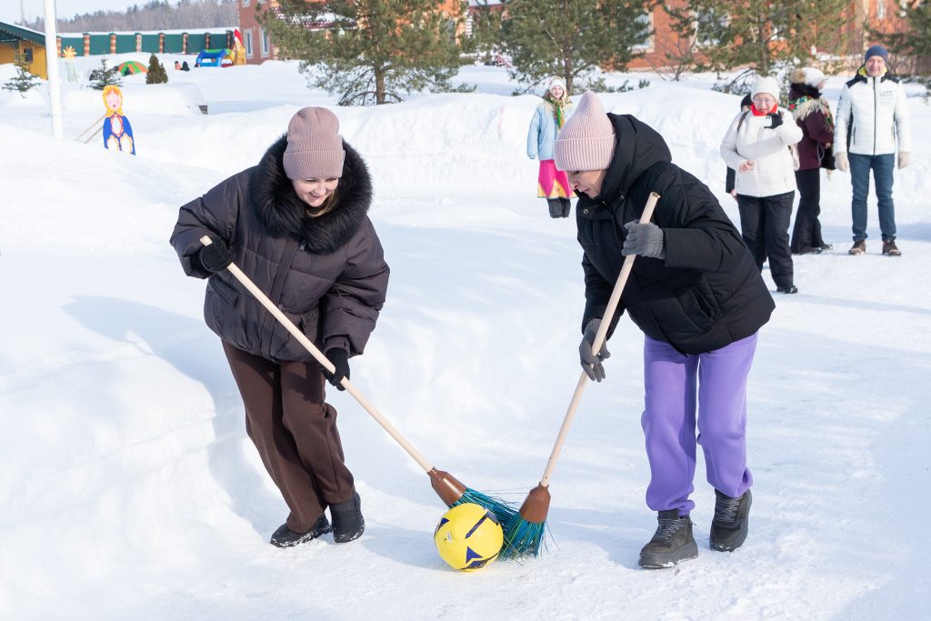 Не менее увлекательными оказались и другие станции. На «Хоккейном снайпере» участники проверяли точность удара. В «Кёрлинге 2.0» пары игроков вооружались швабрами и старались загнать мяч в специальную лунку или до контрольной точки, не отрывая швабры от пола. На станции «Воздушный змей» участникам предстояло преодолеть дистанцию на коротких лыжах, удерживая «воздушного змея». В «Матрёшкином тире» у каждого было три попытки попасть мягким мячиком в одно из отверстий матрёшки. «Стенка на стенку» стала главной битвой дня: от каждой команды выходили по два самых сильных борца, чтобы вытолкать соперников за пределы круга и выявить сильнейшего. А пока судьи подводили итоги, гости праздника участвовали в «Битве хороводов» и выполняли задания ведущего — чистое удовольствие!