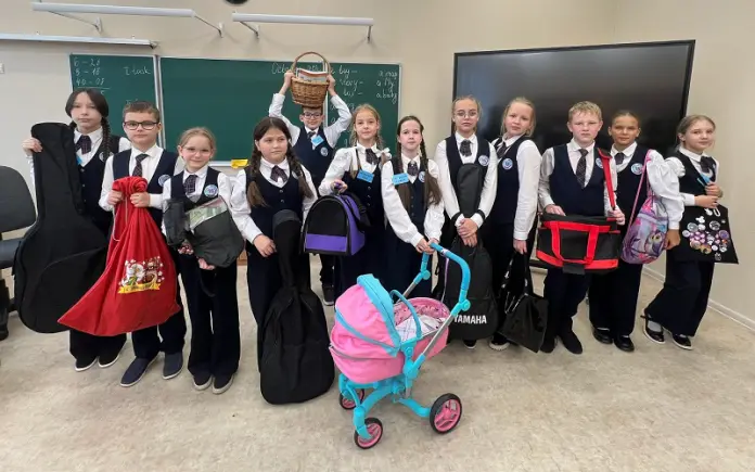 Детям было дано задание – прийти в школу без привычных рюкзаков, придумав креативный способ донести учебники. И они понесли их в чемоданах, коробках, мешках, корзинах, игрушках, колясках. Чего только ни придумали! Повеселили друг друга, учителей, сделали забавные фотографии.