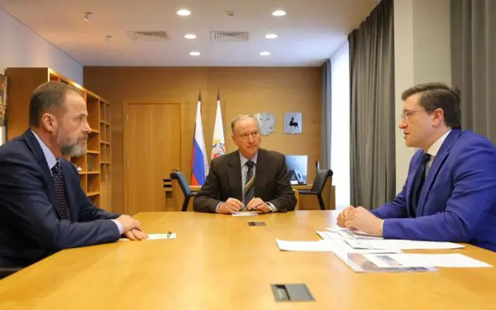Перед совещанием состоялась рабочая встреча Николая Патрушева, Игоря Комарова и Глеба Никитина, где были обсуждены вопросы загруженности судостроительных предприятий региона, перспектив их модернизации и кадрового обеспечения, создания в школах области специализированных инженерных классов по судостроению.