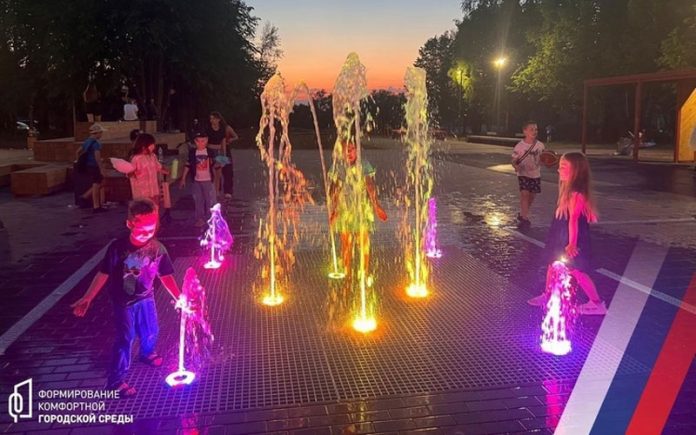 Сейчас рабочие облагораживают газон и подключение инженерных сетей фонтана. Также проведена наладка насосного оборудования.
