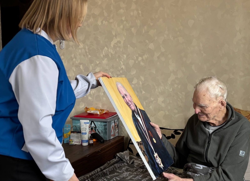 Волонтёры Победы поздравили именинника и вручили ему особенный подарок — портрет, созданный профессиональными художниками в рамках проекта «Краски Победы».