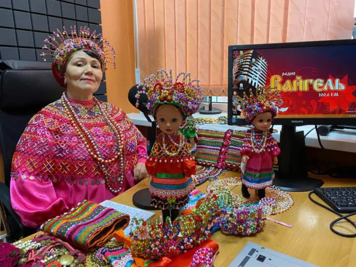 Сегодня главное увлечение мастерицы – создание национальных кукол. На ножках у них непременно сапожки – куда же без них настоящей мордовочке! Гольфы – еще одна важная деталь традиционного девичьего костюма. Ну и, конечно, «Баяравань крганят» – нагрудное украшение, выполненное в технике сетчатого плетения, с узором из геометрических элементов. По краям его украшали крупными бусинами или серебряными монетами. Это украшение полностью закрывало плечи, грудь и спину, доходя до линии локтя. И, разумеется, на голове у куклы традиционный мордовский платок. Такой платок был обязательным атрибутом в гардеробе каждой мокшанки.