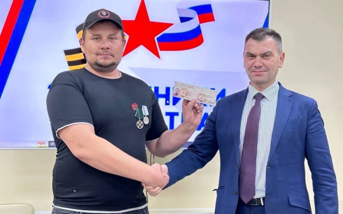 Заветный документ Александру в торжественной обстановке вручил руководитель филиала фонда Алексей Герасименко. На церемонии также присутствовала супруга бойца Татьяна и сотрудники фонда.