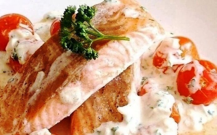 Перед подачей на стол посыпаем ароматную рыбку с грибным соусом шинкованной свежей зеленью.