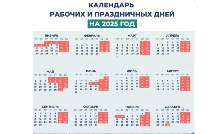 Предпраздничными днями в 2025 году станут 7 марта, 30 апреля, 11 июня и 1 ноября. Продолжительность работы в эти дни должна быть уменьшена на час.