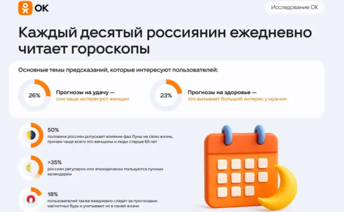 Социальная сеть Одноклассники провела исследование среди россиян, чтобы выяснить, как они относятся к гороскопам, лунным календарям и прогнозам погоды. В преддверии конца года, когда спрос на данный тип контента растет, ОК узнали, верят ли пользователи в предсказания, как часто их изучают и ориентируются ли на них при планировании жизни.