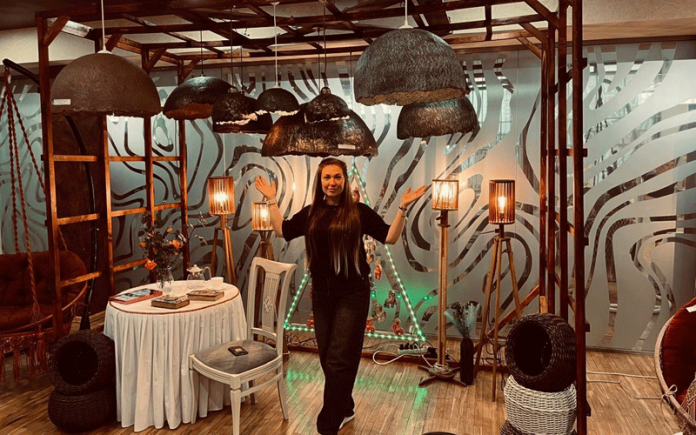 Папье-маше — это бумажная масса. Но Карина Ямбулатова использует не простую бумагу. Она делает интересные абажуры из больших картонных упаковок — лотков для куриных яиц. Чаще всего после покупки провизии такие лотки на 30 яиц выбрасывают. А тут всё идёт во «вторичную переработку», что очень экологично!