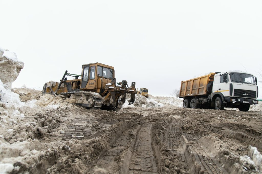 На снежном полигоне эстафету перехватывают бульдозеры, старательно утрамбовывая тяжелыми гусеницами мегасугроб. Машины медленно, но неумолимо взбираются на снежные горы, прессуя сброшенный самосвалами снег, превращая его в плотную массу. Высота снежных завалов достигает 4-х – 5-ти этажный дом. Также на полигоне есть огромный овраг, куда сбрасывается привезенный снег. На данный момент он уже полностью заполнен.
