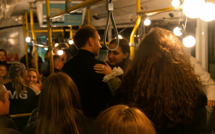 Стартовали мы с остановки возле Пушкинского парка. Обычный вечер, мы садимся на свои места и не замечаем, как становимся частью большого представления. Девушка Оля обращается к сидящим: «А какое у вас любимое место в городе? У меня — Советская площадь…» — и продолжает свои размышления о капсуле времени, которая была запечатана в здании городской администрации. Пассажиры строили догадки, что там могло быть написано? Предположения доходили даже до абсурдных, например, что там были спрятаны тайные разработки инопланетян. Но оказалось всё просто: капсулу вскрыли в 2017 году, и если кратко, послание звучало так: «Мы трудимся на благо Советского Союза, так и вы — потомки, трудитесь и делайте всё для Советского Союза!»