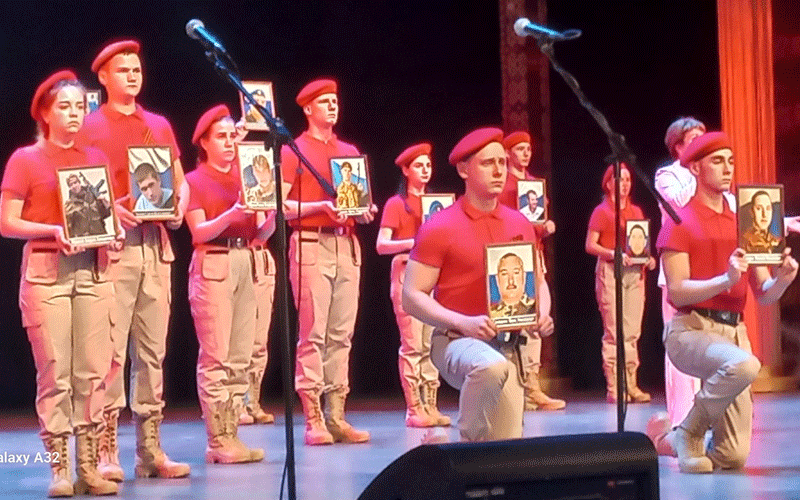— Мы молимся с вами, и ждем вместе с вами, — обратилась она к матерям, женам военнослужащих. Под песню «Небесная рать» ансамбля «Светлица» на сцену вышли учащиеся, неся в руках портреты погибших земляков – участников спецоперации. Отдавая дань памяти, они опустились на колени, а весь зал встал, не сдерживая слез.