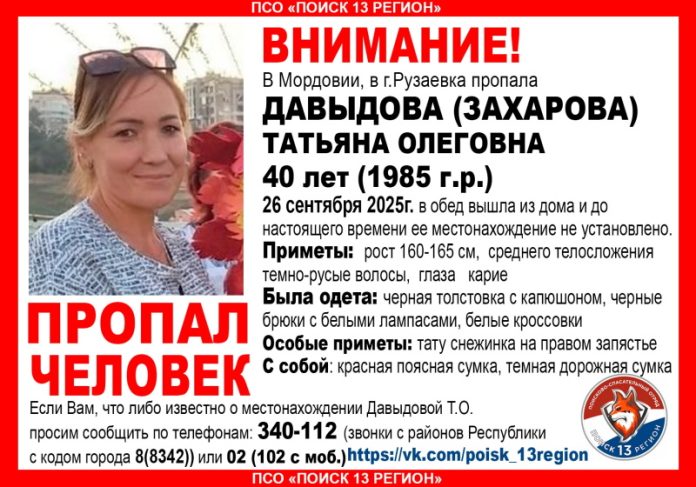 В Мордовии без вести пропала Татьяна Давыдова (Захарова). Как сообщают волонтеры, 40-летняя жительница Рузаевки ушла из дома 26 сентября и назад не вернулась.