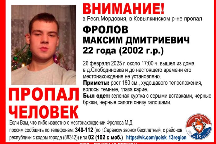В Мордовии ищут без вести пропавшего Максима Фролова из Ковылкинского района. Как сообщает поисковая группа, 22-летний парень ушел из дома в деревне Слободиновка 26 февраля и назад не вернулся.
