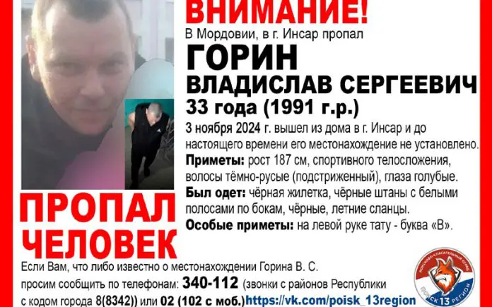 В Мордовии без вести пропал 33-летний Владислав Горин. Как сообщают поисковики, 3 ноября житель Инсара ушел из дома и назад не вернулся. На тот момент он был одет в черные брюки с белыми полосками по бокам, черную жилетку, на ногах – черные сланцы. Рост мужчины 187 см, он спортивного телосложения, короткие темно-русые волосы, глаза голубые.