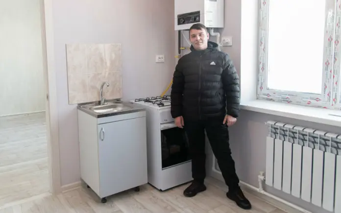 Станислав Симонян из п.Ромоданово, не скрывая счастливой улыбки, внимательно осматривает своё новое жилье по улице Дружбы. Молодому человеку нравится всё: красивые светлые обои, светлый пол, оборудованная ванная комната, плита, в квартире есть горячая вода, проведен газ, электричество, а на окнах даже установлены москитные сетки. Заезжать сюда можно уже хоть завтра и жить долго и счастливо, что он и собирается сделать, въехав сюда вместе со своей второй половинкой и маленьким сыном. При этом в скором времени у пары появится еще один ребенок, а значит дом будет полная чаша. Возле своего дома Станислав собирается разбить огород, обязательно посадить картошку, фруктовые деревья и кустарники.