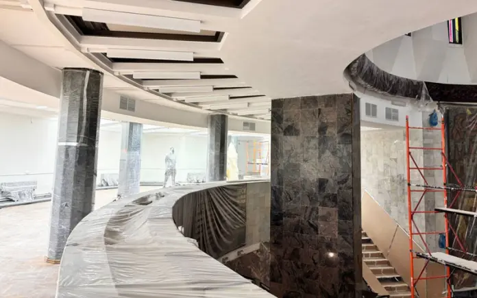 Также завершаются работы по монтажу отопления и электроснабжения, продолжаются работы по установке витражей входной группы, установке дверей, потолка и малярные работы.