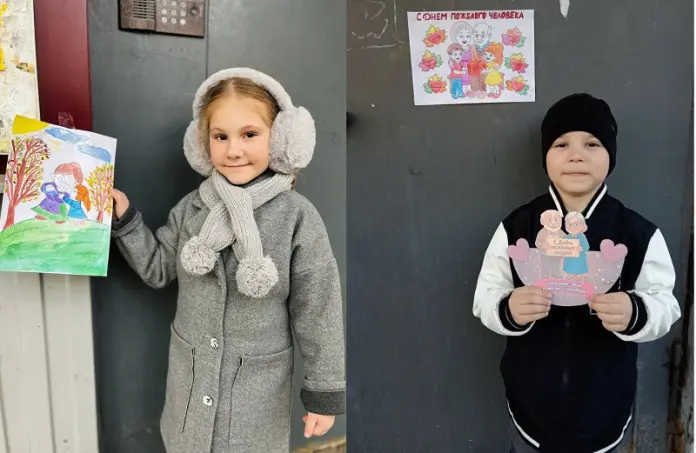 В месячник пожилого человека дети подготовили тематические рисунки с поздравлениями и развесили их на подъездах близлежащих домов. Затея юных художников не осталась незамеченной. Рисунки порадовали пожилых соседей.