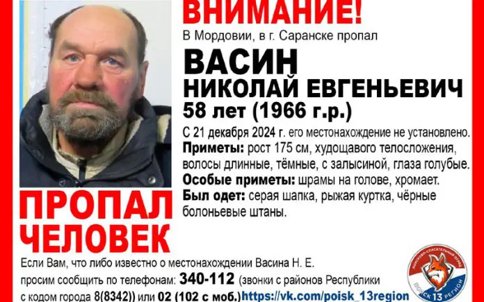 В Саранске без вести пропал Николай Васин. Как сообщают поисковики-волонтеры, 58-летний мужчина ушел из дома 21 декабря и назад не вернулся.