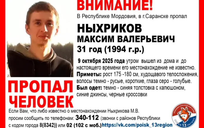 В Саранске без вести пропал Максим Ныхриков. Как сообщают волонтеры, 34-летний мужчина ушел из дома 9 октября и назад не вернулся. На тот момент он был одет в толстовку темно-синего цвета, синие джинсы и черные кроссовки.