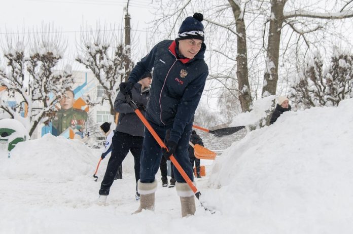 А вот мэр Саранска Владимир Быков зарядку с лопатой делает с 6 часов утра. Проехался по городу, посмотрел, как обстоят дела. Где-то помог машину вытолкать, где-то снег во дворе убрать.