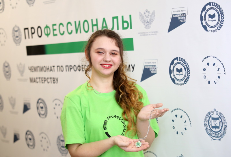 Марина Степанова стала победителем республиканского чемпионата «Профессионалы» в компетенции «Агрономия». На церемонии награждения в Саранске она была в фирменной футболочке «Профессионалов» и с необычным украшением на шее. Кулон с эффектным орнаментом — явно эксклюзив! Но не сразу догадаешься, что это ручная вышивка. Настолько тонкая работа, так деликатно исполнен рисунок, что сложно представить, как это можно вышить.