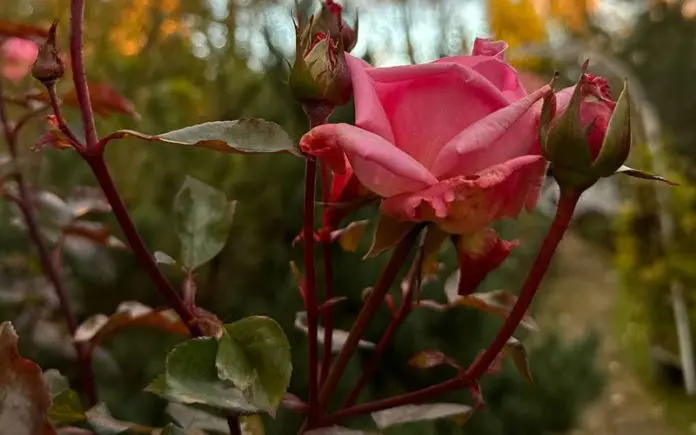 Отличить побеги шиповника можно и по их виду. Они ярко зеленого цвета с небольшими шероховатыми листьями, густо покрыты мелкими шипами. Могут прорастать как в средине розового куста, так и на некотором расстоянии от него. Побеги же большинства селекционных роз имеют красноватый оттенок, более крупные глянцевые листья и крупные шипы