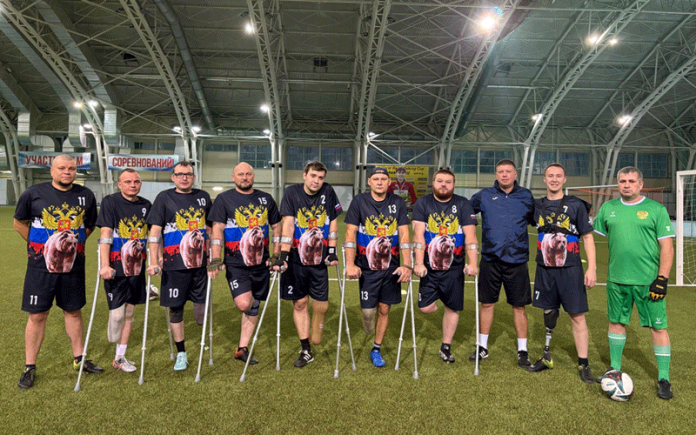 Ровно в 16:30 спортсмены уже на Футбольно-легкоатлетическом манеже, сразу видно – люди военные, пунктуальные. Вот они, красавцы – в фирменной форме с изображением медведя, символа силы русского народа. Сняв протезы, в руки берут костыли и выходят на поле. Отрабатывают пас, работают на ускорение, укрепляют оборону и защиту, а вратарь точным движением ловит мяч, летевший в девятку.