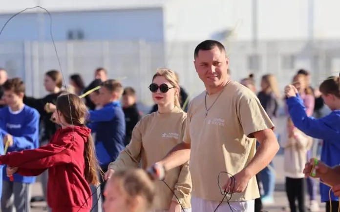 Под руководством мастера спорта по художественной гимнастике из академии Винер Валерии Слесаревой участники спортивного мероприятия совершили ряд общеукрепляющих упражнений со скакалкой – растяжку, вращения и прыжки на месте.